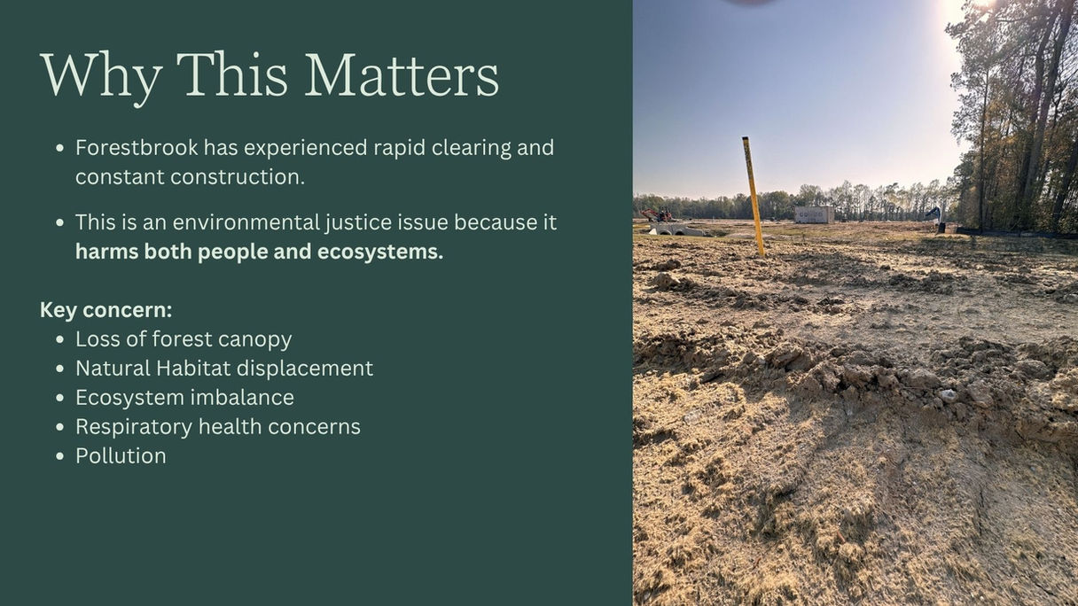 Forestbrook in Horry County, South Carolina, has undergone a rapid transformation from a forested landscape into an area dominated by ongoing construction and land clearing. What once functioned as the ecological “lungs” of the community, the tree canopy, birdsong, shade, and soil stability, now has been replaced by exposed clay soils, heavy machinery traffic, and construction debris. This shift represents an environmental justice concern because it affects both the human residents and the more‑than‑human ecosystems embedded within the community.